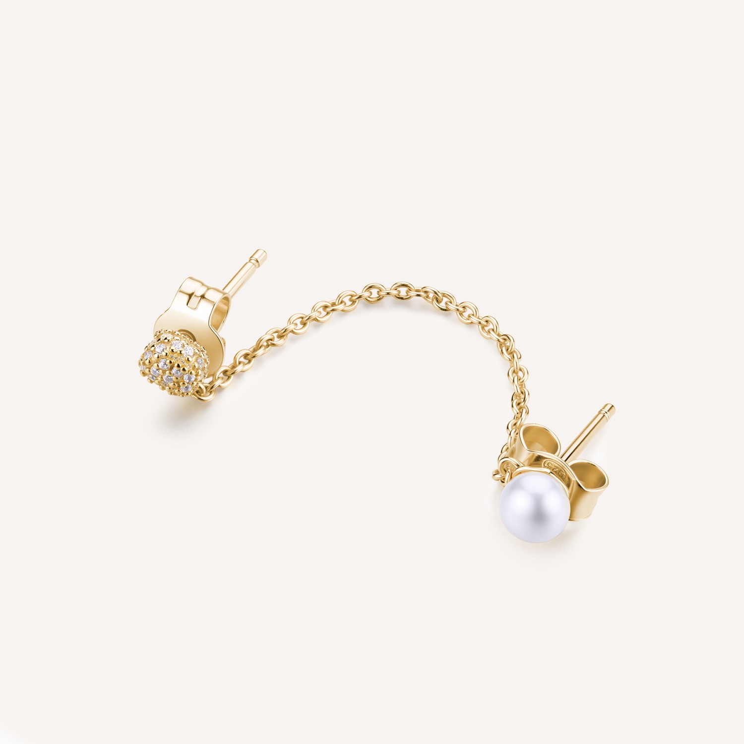 Mono orecchino doppio con catena in argento 925‰, placcatura oro giallo, 27 cubic zirconia bianchi, 1 perla naturale