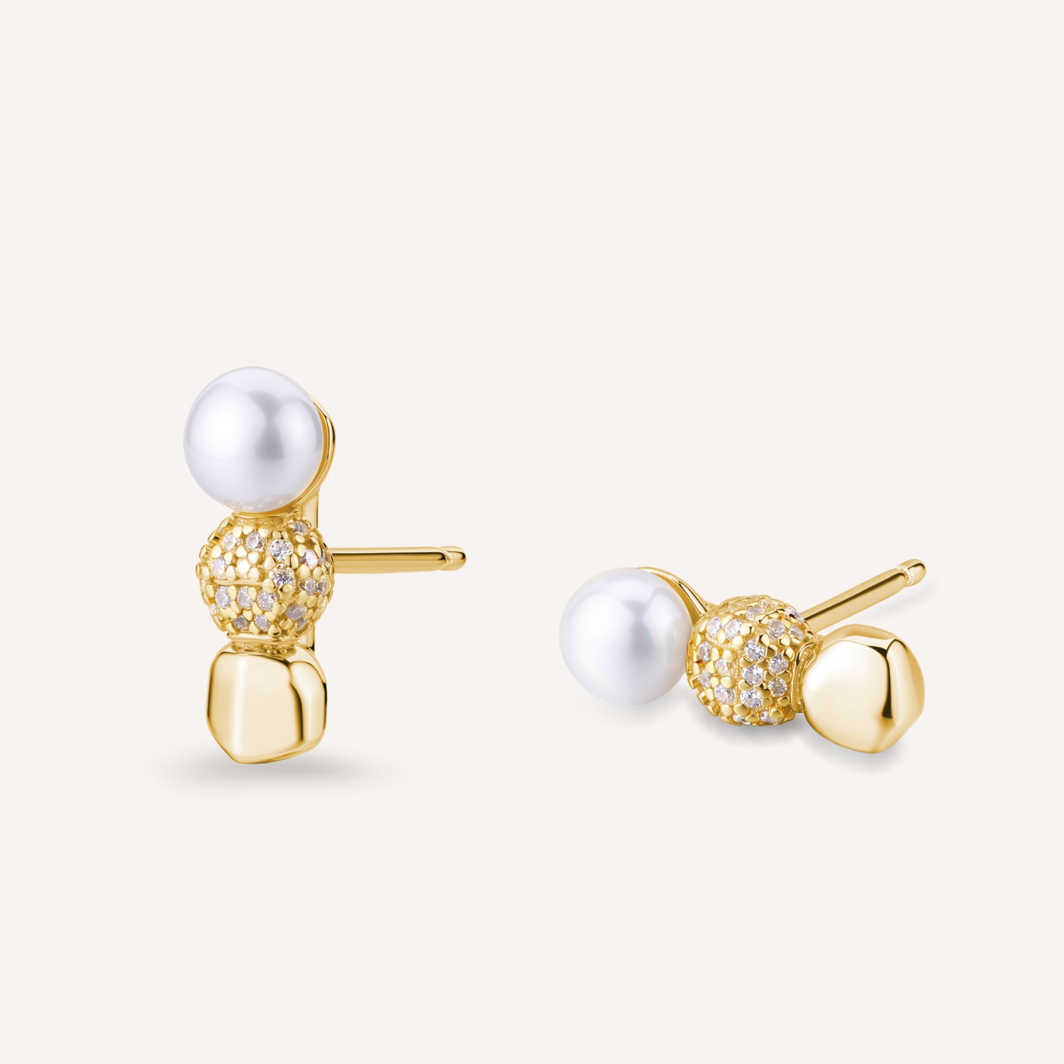 Orecchini al lobo in argento 925‰, placcatura oro giallo, 64 cubic zirconia bianchi, 2 perle naturali