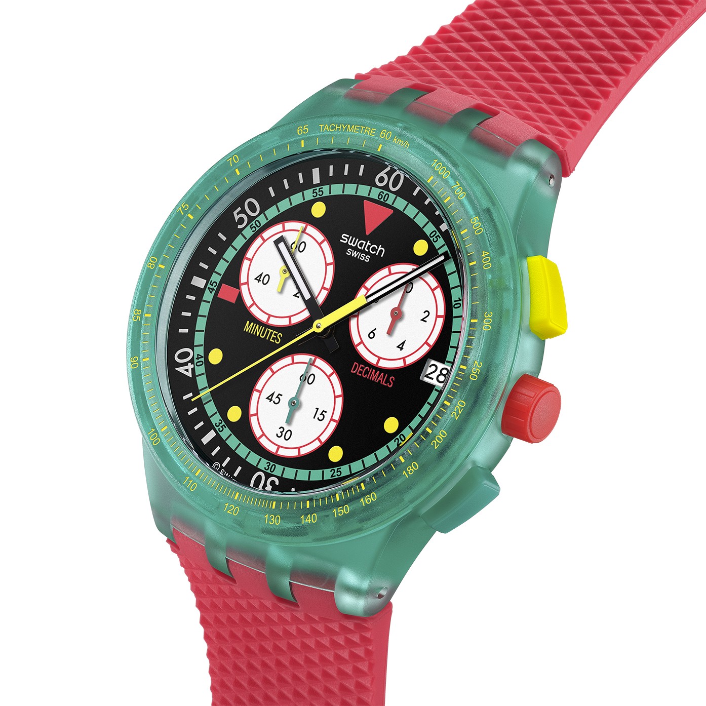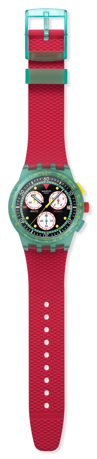 Questo cronografo rétro si ispira a uno Swatch GENT anni '80: l’EMERALD DIVER da collezione (GG703). Il quadrante multicolore presenta lancette delle ore e dei minuti nere che si illuminano al buio, lancetta dei secondi del cronografo gialla e datario a ore 3. La cassa verde opaco trasparente è completata da una lunetta coordinata con scala tachimetrica stampata in giallo. Completa l’orologio un cinturino testurizzato rosso opaco con passante e fibbia color verde trasparente opaco.