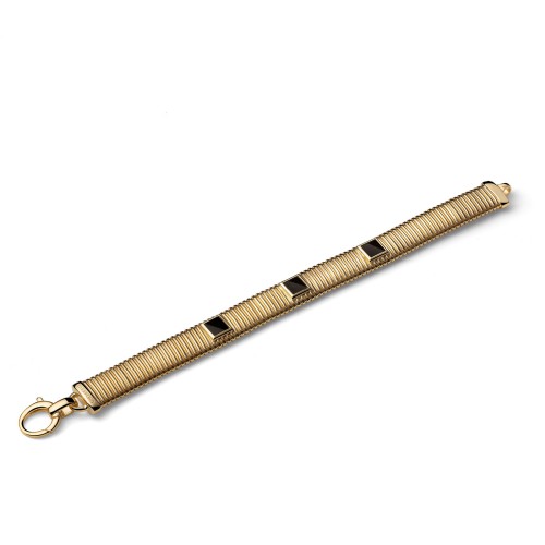 Bracciale in argento 925 dorato in maglia tubogas con dettaglio quadro e onice nera. Altezza fascia 1,20 cm, lunghezza 19,00 cm. Collezione Premium.