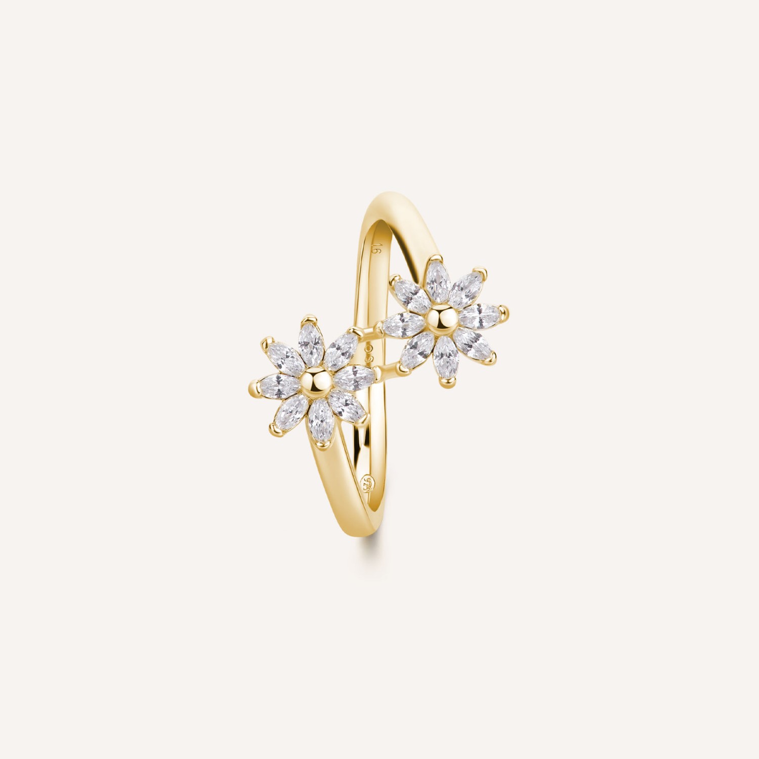 Anello aperto con doppi fiori in argento 925‰, placcatura oro giallo, 16 cubic zirconia bianchi