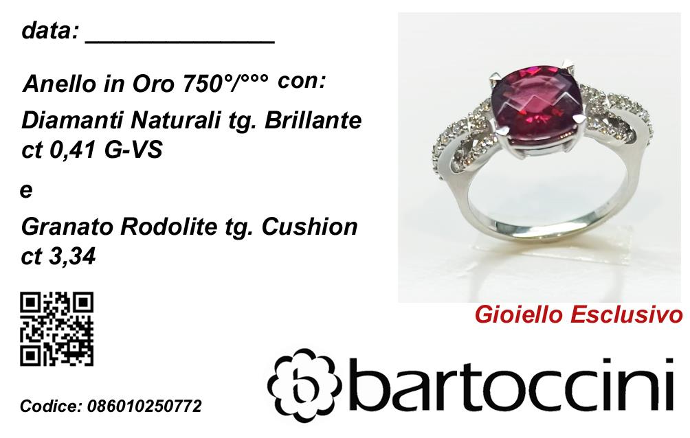 Anello in Oro Bianco 18 kt con Granato Rodolite taglio Cushion 3,34 ct e Diamanti naturali taglio brillante 0,41 ct G-VS