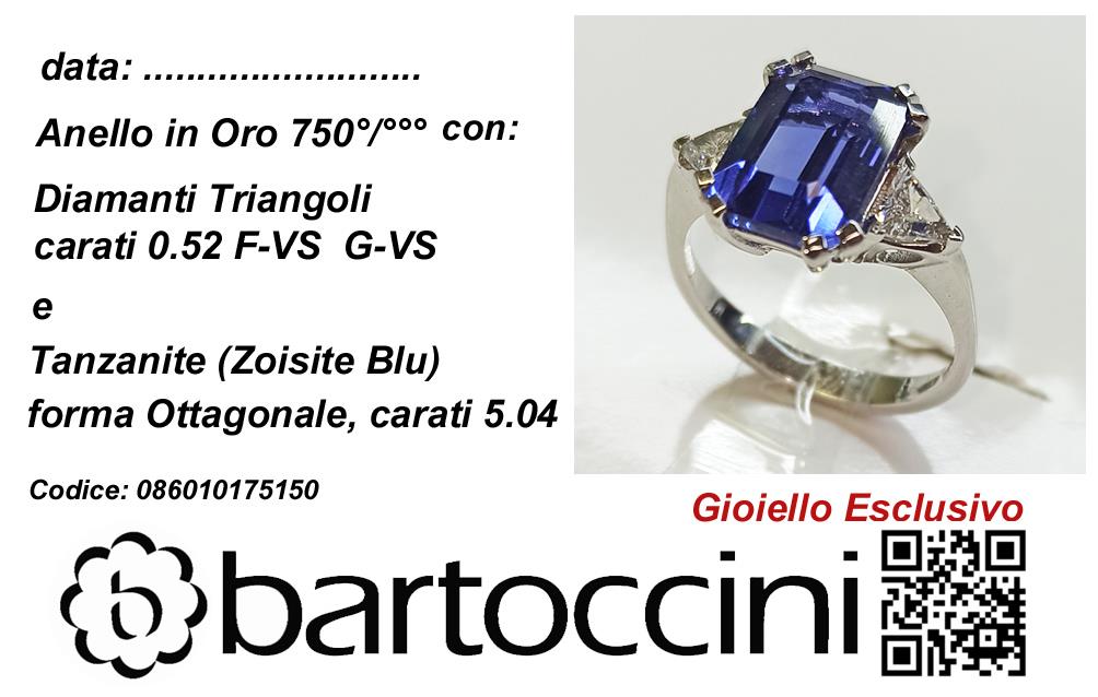 Anello in Oro Bianco 18 kt con Tanzanite ottagonale 5,04 ct e triangoli di Diamanti naturali 0,52 ct F-VS