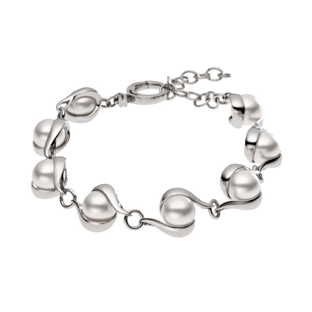 Bracciale acciaio lucido, perle e cristalli. Misura: 19 cm + 5 cm estensione