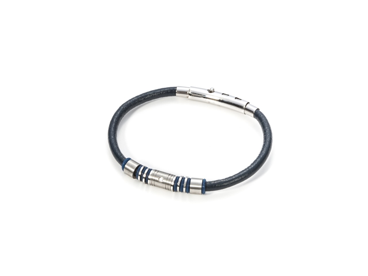 Description: Bracciale collezione Hides in Pelle, con Centrale in Acciaio e passanti Blu. - Collezione: Primaver