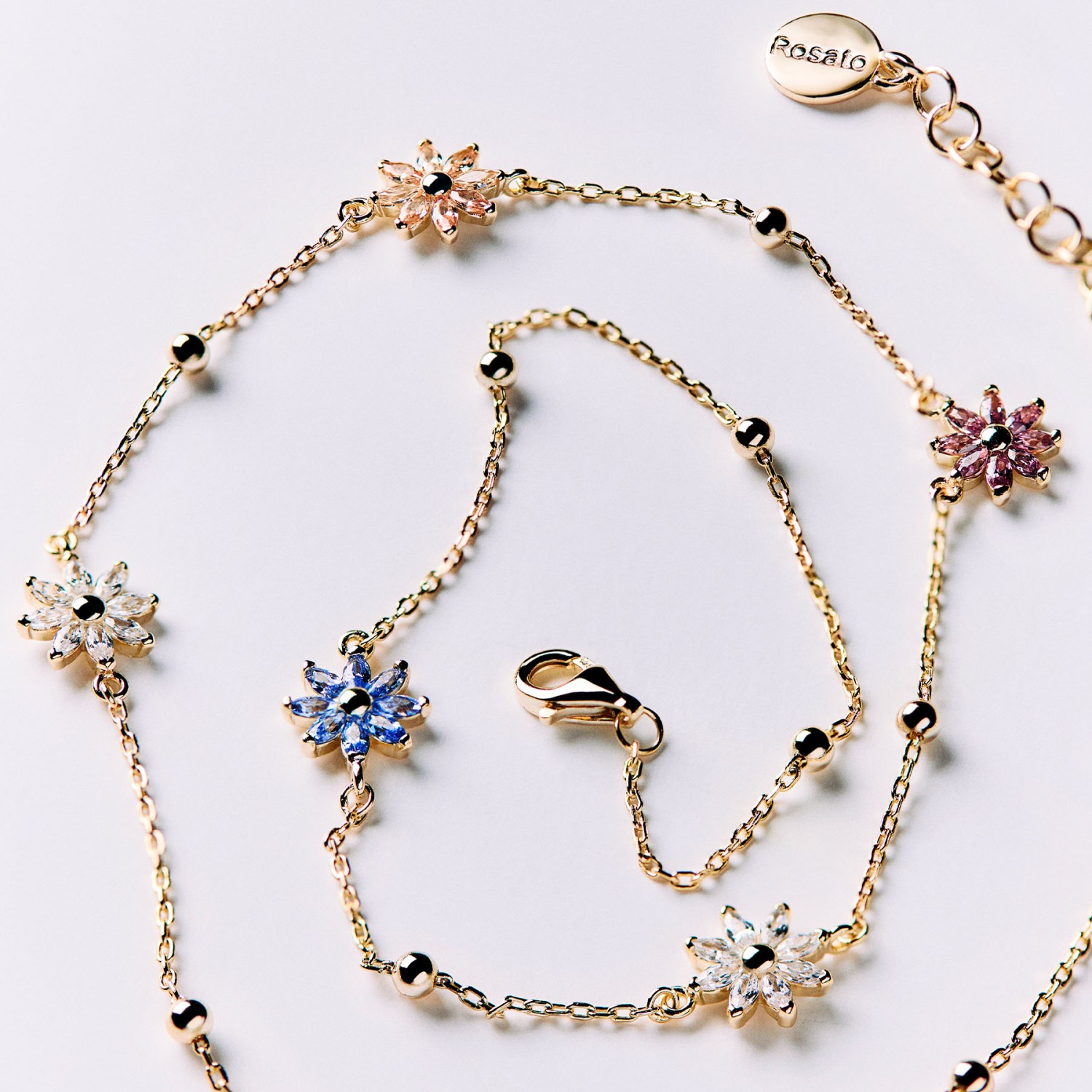 Collana corta in argento 925‰, placcatura oro giallo, 8 cubic zirconia bianchi, rodolite, blu e champagne