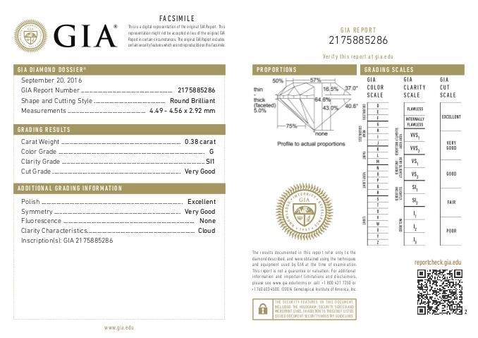 Diamante certificato GIA (Gemological Institute of America) con iscrizione laser sulla cintura del numero seriale. Andando sul sito www.gia.edu ed inserendo il numero del certificato, si possono visualizzare e stampare le caratteristiche della propria pietra.