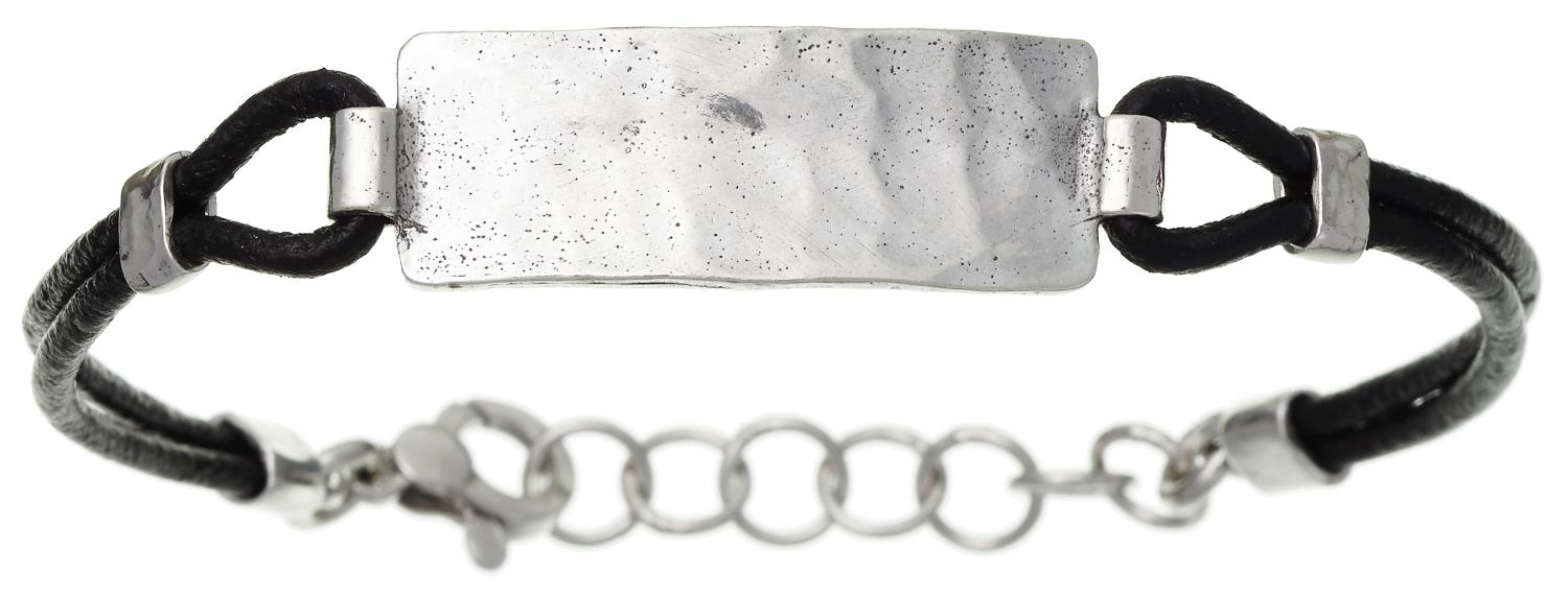 Bracciale in Argento 925 e cuoio nero Lunghezza 22 cm Lunghezza decoro piastrina 3,7 cm Lunghezza regolabile con chiusura a moschettone Fatto a mano in Italia