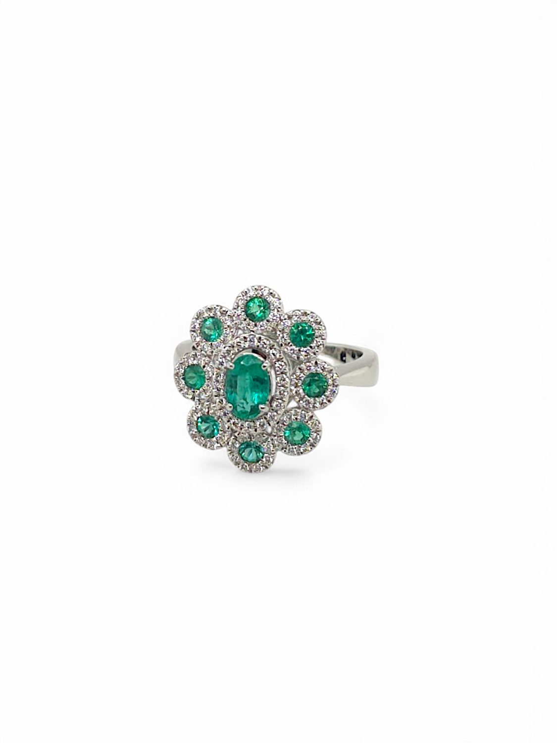 Anello fiore in Oro Bianco 18 KT , Smeraldi 0.82 ct. Diamanti naturali taglio brillante 0.30 ct.