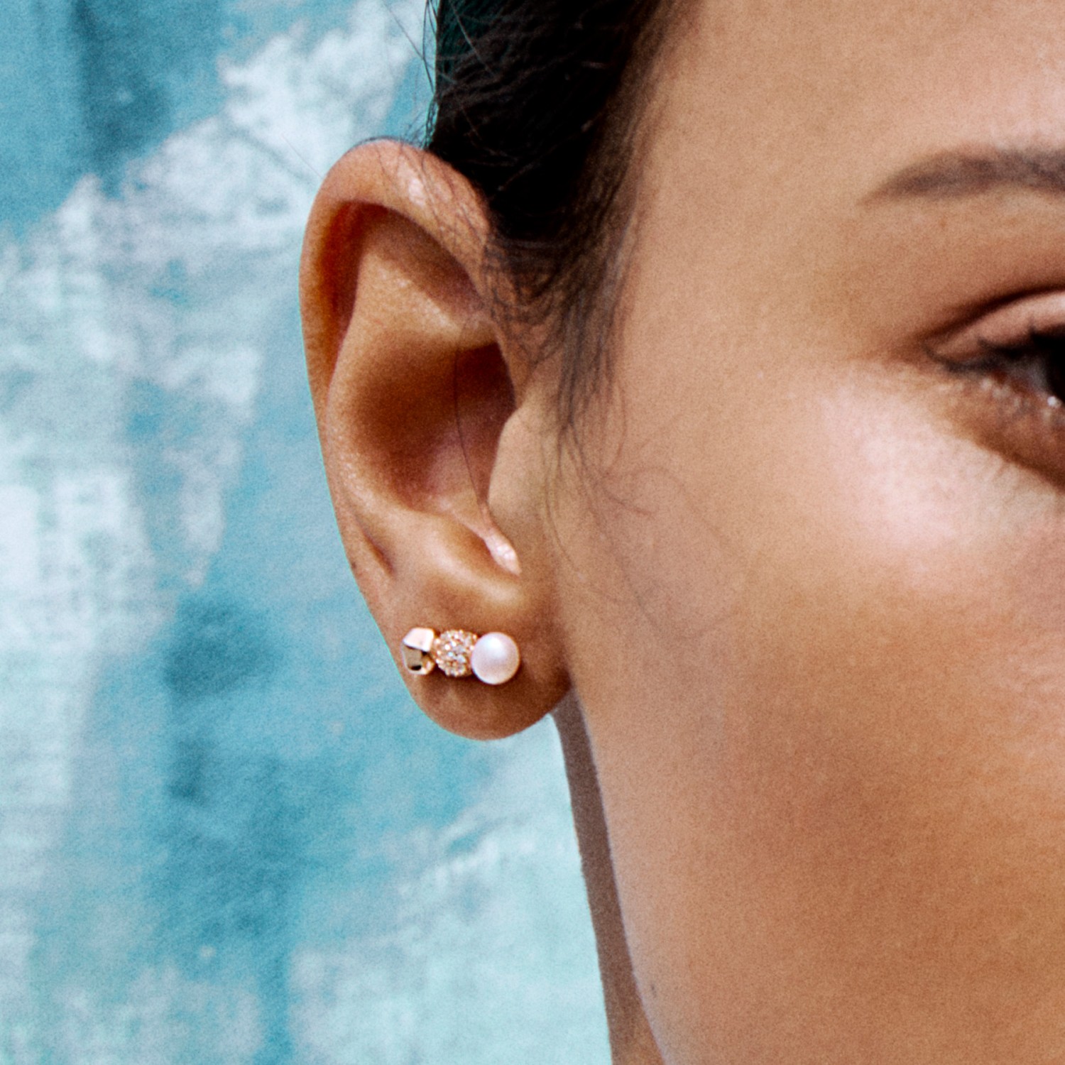 Orecchini al lobo in argento 925‰, placcatura oro rosa, 64 cubic zirconia bianchi, 2 perle naturali