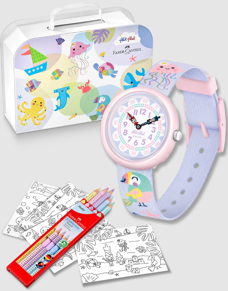 Il set per bambini COLOR IN PASTEL include un incantevole orologio, una confezione di matite Jumbo Grip Pastell coordinate e quattro cartoline, il tutto elegantemente confezionato in un astuccio speciale. È il regalo perfetto per i piccoli artisti!