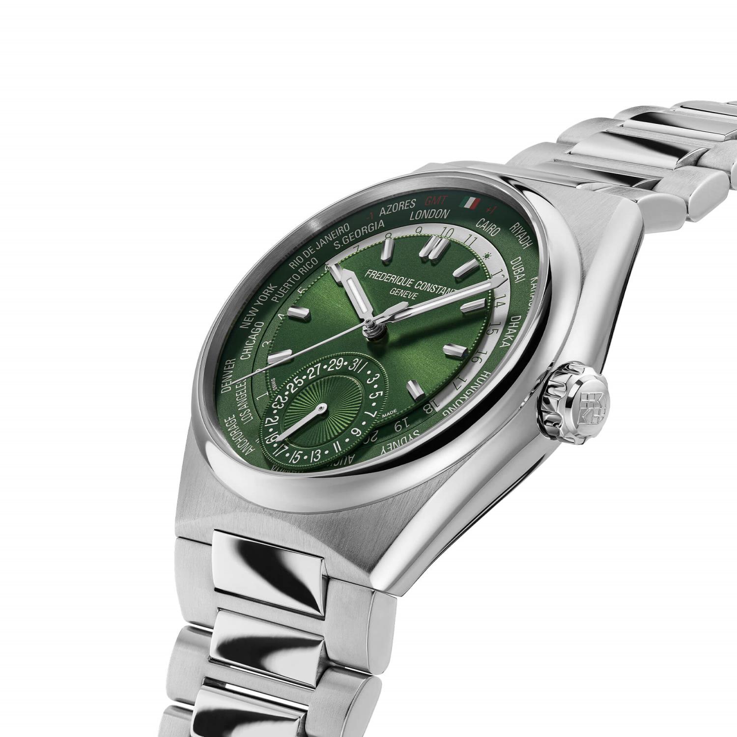 Orologio da uomo automatico di manifattura, cassa e bracciale in acciaio, quadrante verde con 24 fusi orari, datario a ore sei.