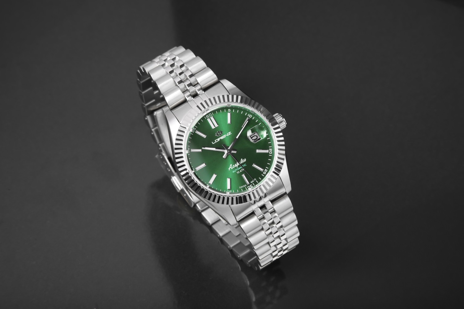La collezione Acapulco di Lorenz è un omaggio alla celebre località messicana, simbolo di glamour, spiagge esclusive e vita notturna raffinata. Pensata per chi ama distinguersi con stile, questa linea iconica unisce design sportivo ed eleganza classica. Il modello presenta una cassa in acciaio massiccio da 39 mm con lunetta zigrinata o liscia, abbinata a un raffinato bracciale acciaio. Il vetro zaffiro con lente garantisce massima leggibilità del datario posizionato a ore 3, mentre il fondello e la corona a vite assicurano un'impermeabilità fino a 100 metri. Al suo interno batte un affidabile movimento automatico Sellita SW200, una garanzia di precisione svizzera. Il bracciale solido con chiusura a doppio pulsante completa l'esperienza, offrendo comfort e sicurezza al polso. Un orologio pensato per chi ama l'eleganza sportiva e vuole lasciare il segno, in ogni occasione.