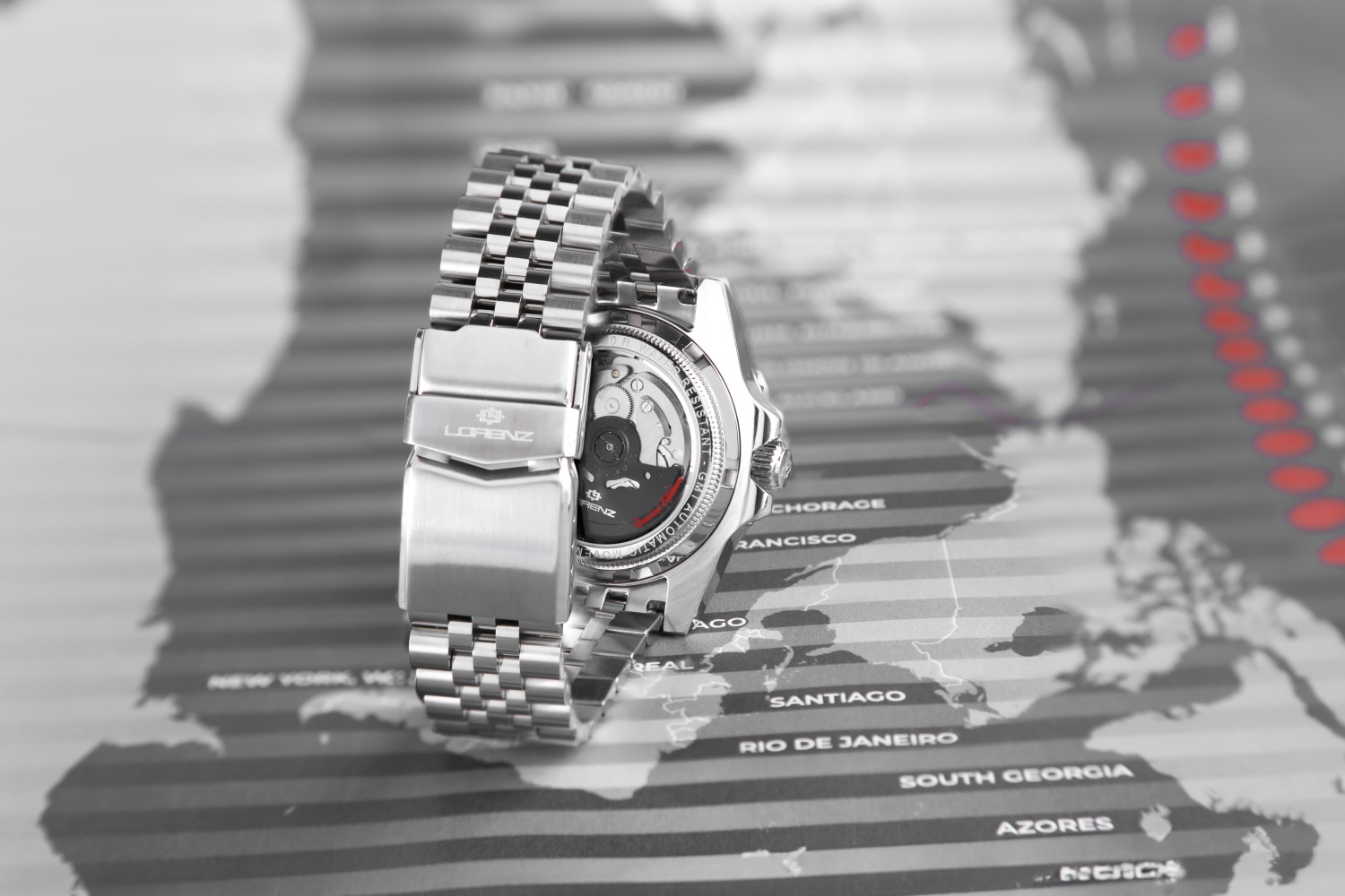 Questo orologio rappresenta l'ultima evoluzione dei modelli GMT di Lorenz. La cassa, realizzata in acciaio 316L con finitura lucida e satinata, ha un diametro di 40 mm. Il fondello trasparente a vite consente di ammirare il movimento TM NH34, caratterizzato da una massa oscillante personalizzata nel colore. La lunetta unidirezionale a 120 scatti è realizzata in ceramica solida a due colori, mentre il bracciale jubilèe con finitura lucida e satinata si abbina perfettamente al quadrante particolare, con un effetto degradè in due tonalità, conferendo al segnatempo un aspetto sportivo e distintivo. Con un'impermeabilità fino a 200 metri, questo orologio è il compagno ideale per le vostre avventure, che si tratti di un viaggio o della vita quotidiana.