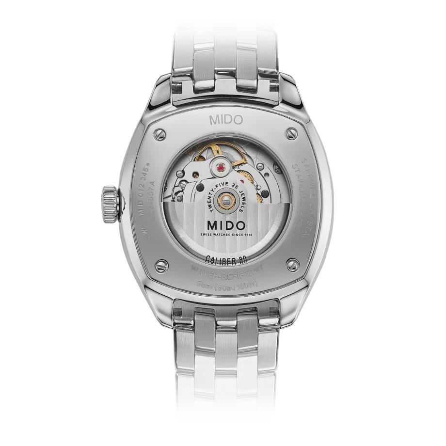 Orologio meccanico automatico CALIBRO 80 MIDO, riserva di carica 80 ore, con cassa in acciaio 41,80 mm x 41,30 mm, vetro zaffiro, fondello a vista, bracciale in acciaio, quandrante argentè