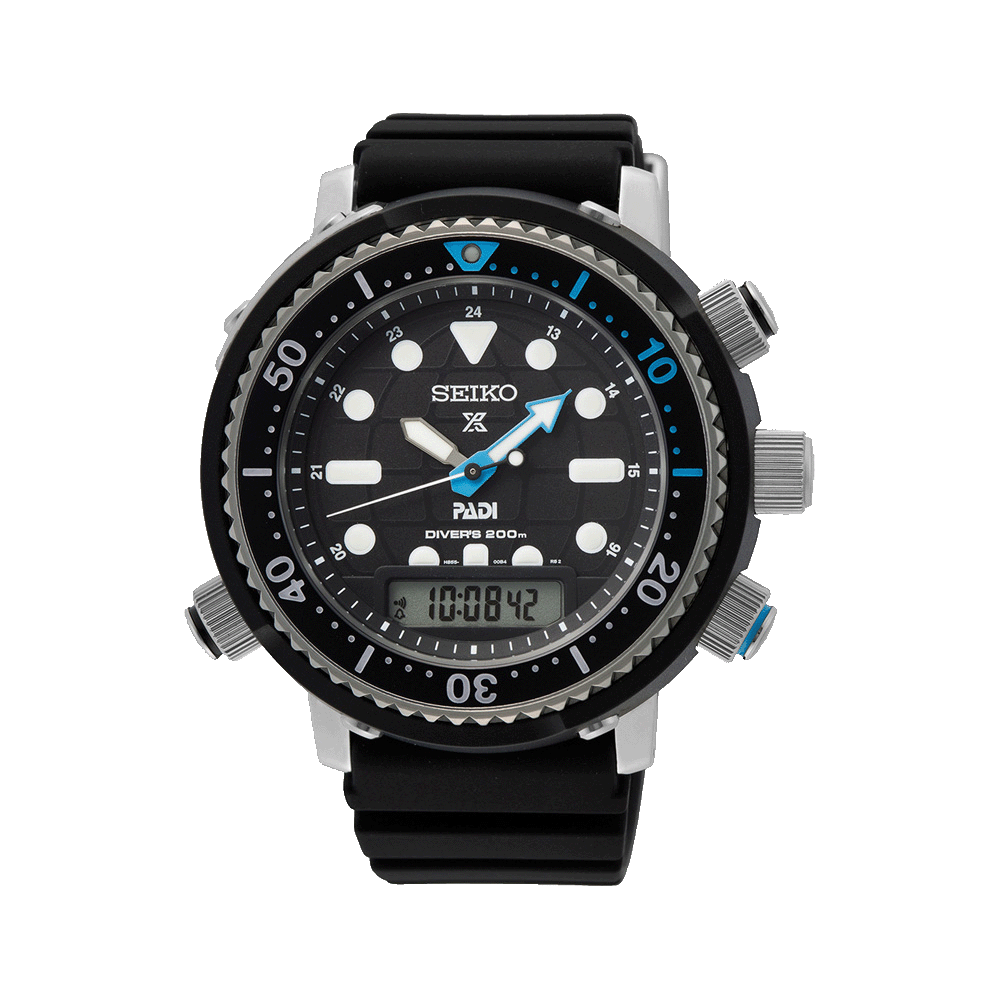 Questo orologio subacqueo Prospex ha la peculiarità di avere un display ibrido, uno schermo digitale che sovrasta l'indicazione analogica a ore 6. Questa edizione speciale Padi si distingue per i richiami blu laguna visibili sulla lunetta girevole e sulla lancetta. Il segnatempo in acciaio inossidabile con rivestimento in titanio carbonizzato antigraffio è alimentato da un movimento al quarzo a energia solare che non richiede batterie ed è abbinato ad un pratico e comodo cinturino in silicone.