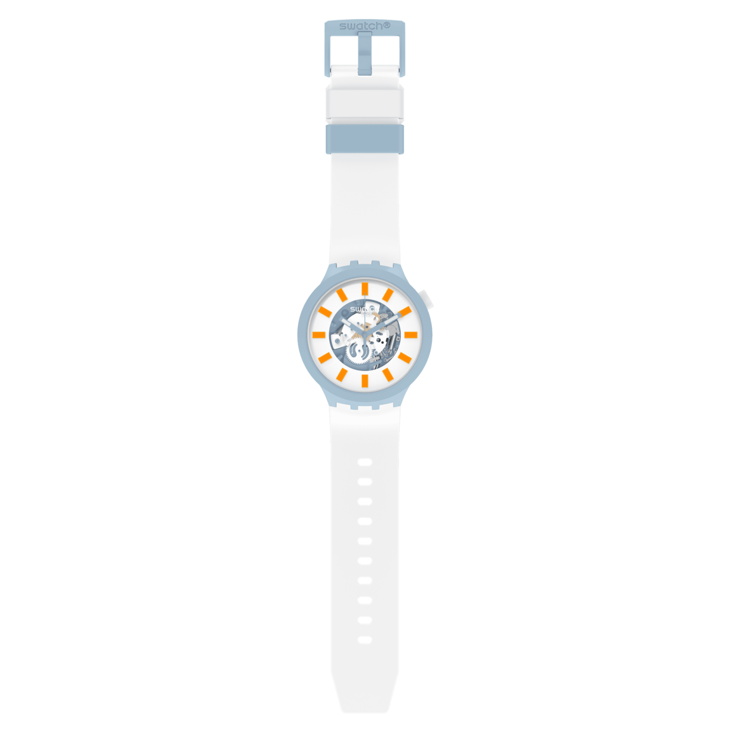 Cassa in Materiale bioceramico di colore Blu e di forma Rotonda -Cinturino in MATERIALE DI ORIGINE BIOLOGICA di colore Bianco