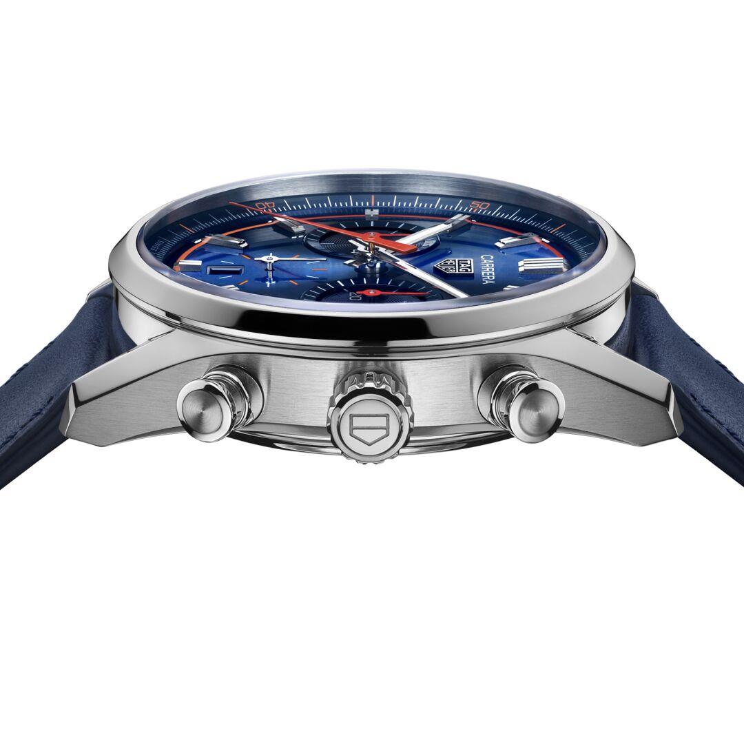 Questa interpretazione moderna e dinamica del TAG Heuer Carrera mette in primo piano lo spirito delle corse automobilistiche. Con un anello arancione sfumato e accesi accenni arancioni, il quadrante blu profondo si abbina perfettamente al cinturino in pelle di vitello blu