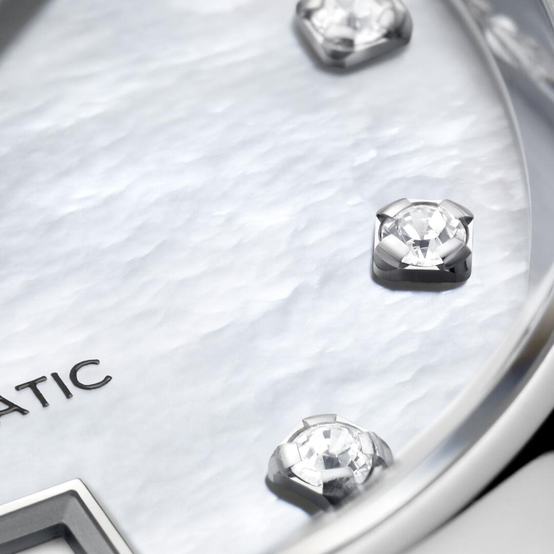 Con raffinato quadrante in madre perla bianca con 11 indici delle ore in diamante (0,088 carati) e lancette rodiate