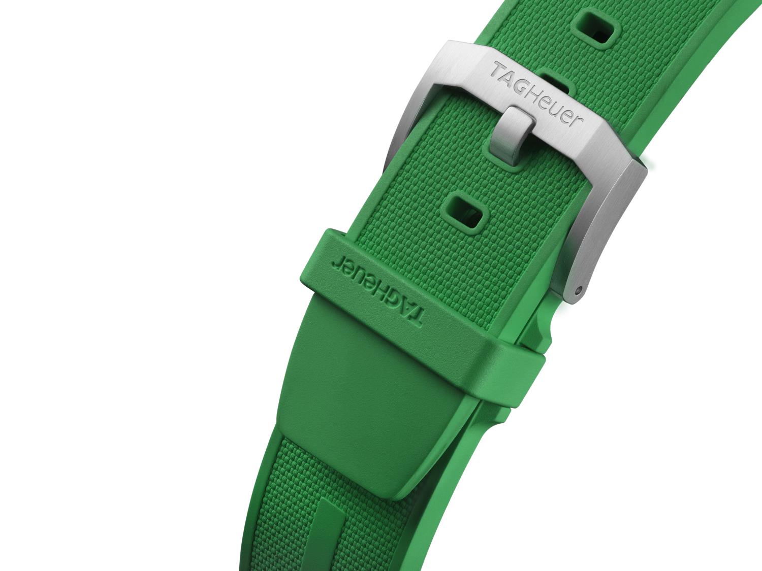 TAG Heuer Formula 1, con un quadrante verde acceso e un cinturino in caucciù abbinato, questo modello ispirato alle corse automobilistiche sfreccia dritto verso la vittoria.