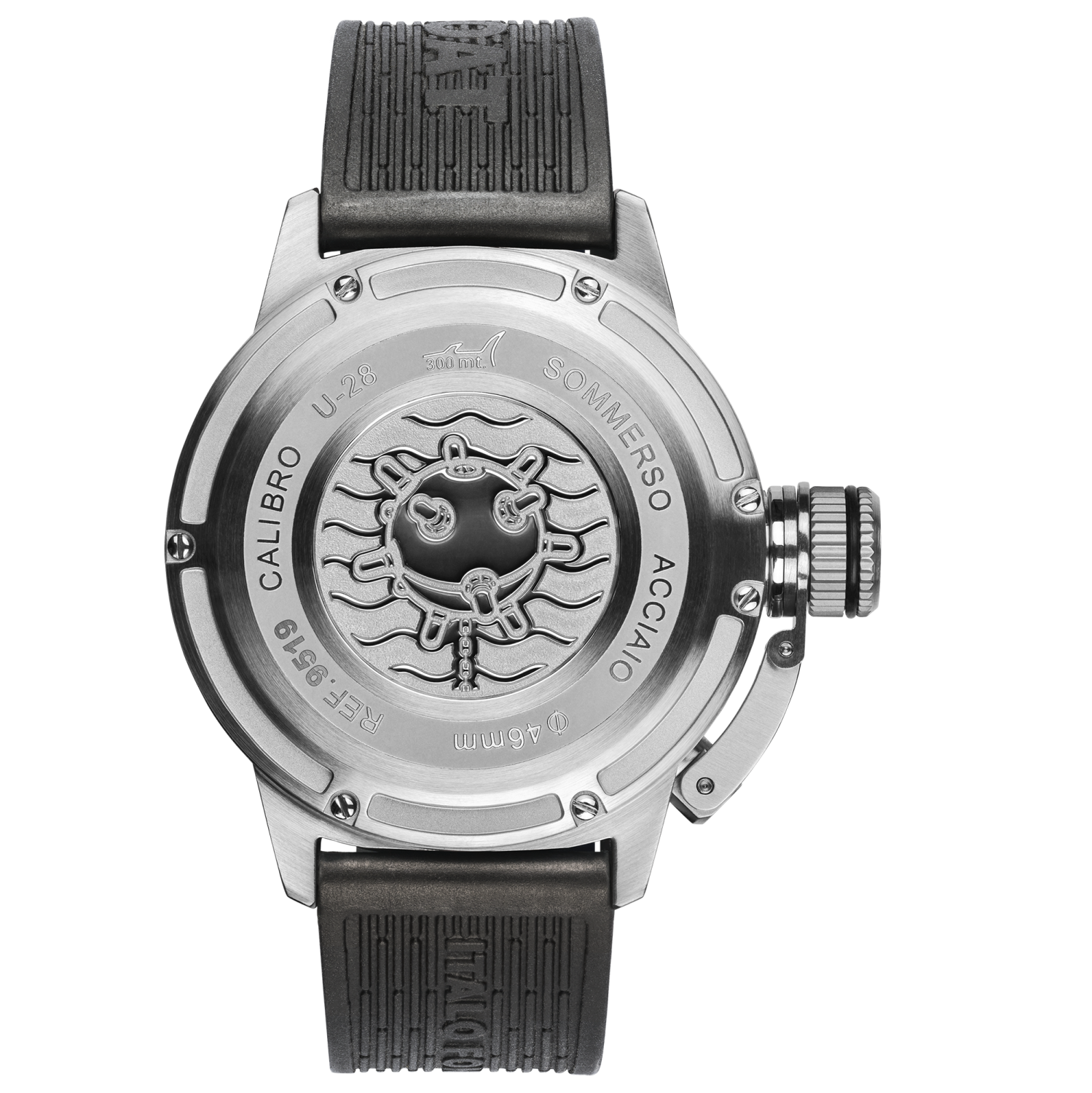 meccanica svizzera a carica automatica Sellita SW 200 con modifiche tecniche su specifiche U-BOAT. Frequenza 28.800 alternanze/ora. Riserva di carica: 41 ore. 26 rubini. Rotore scheletrato.
