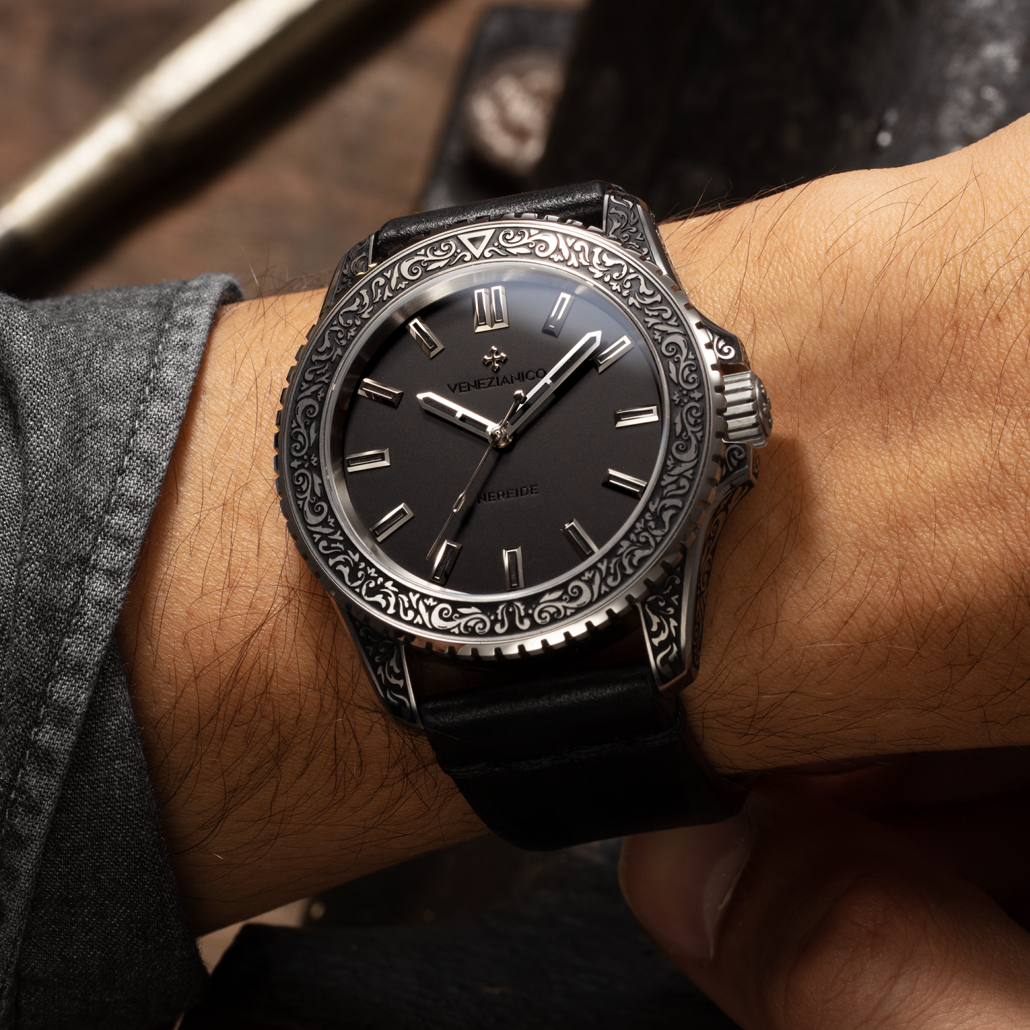Il Nereide Acquaforte si distingue per la sua cassa finemente incisa, decorata con una raffinata trama rinascimentale ispirata alle foglie di acanto, che rende omaggio all’eleganza senza tempo dell’arte neoclassica. Il quadrante nero minimalista, impreziosito da indici lucidi, crea un perfetto equilibrio tra estetica e funzionalità. Per la prima volta, indici e lancette sono rivestiti con Swiss Super-LumiNova® Nero, emettendo una delicata luminescenza verde che garantisce una leggibilità impeccabile anche in condizioni di scarsa luce, mantenendo al contempo l’anima artistica e neoclassica di questo segnatempo.