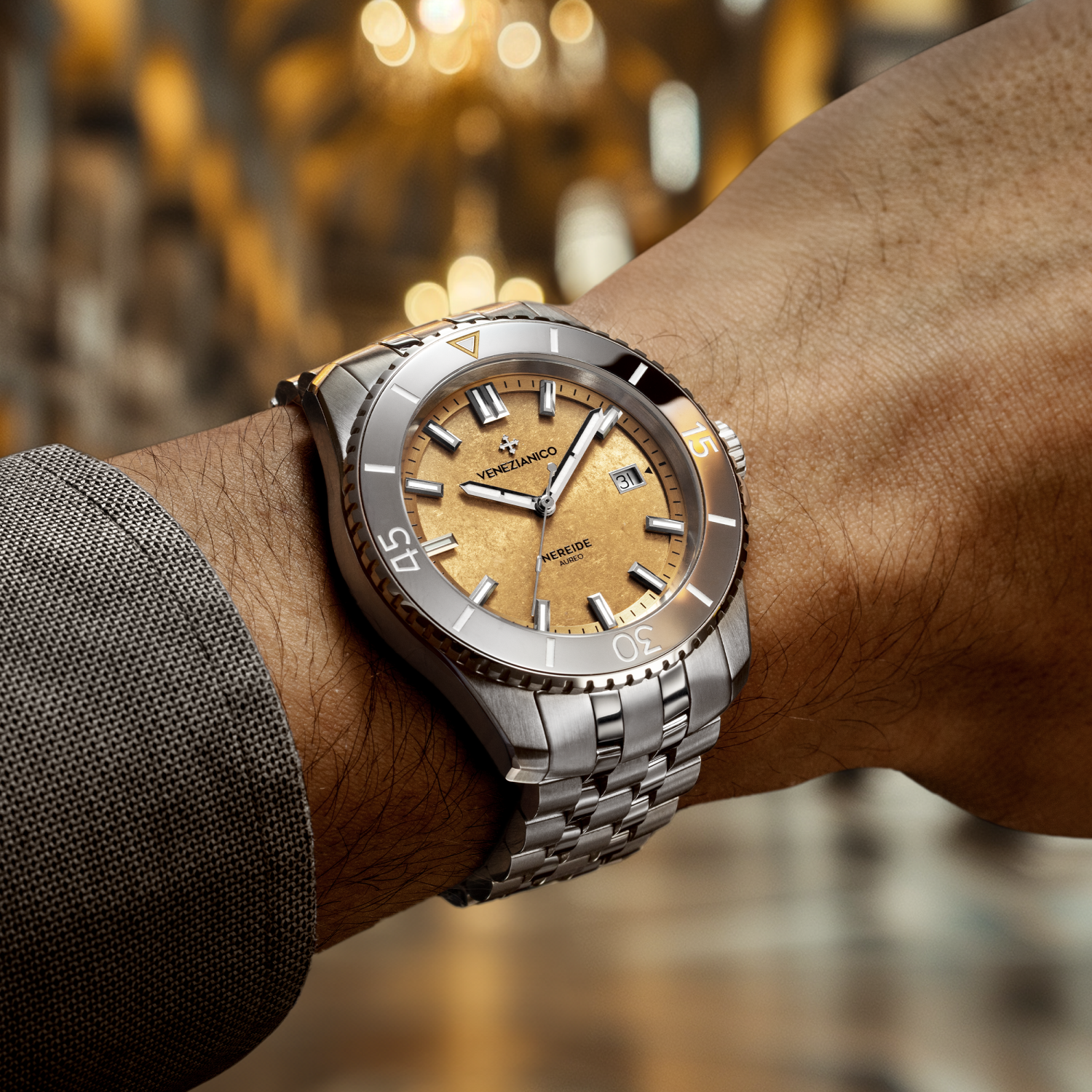 Il Nereide Aureo è un orologio subacqueo che fonde eleganza e innovazione. Il suo quadrante, ornato da un trattamento in oro puro 24k con finitura increspata, evoca l'antica arte veneziana della laminazione. La robusta cassa in acciaio 316L, unita a una lunetta in tungsteno, si integra perfettamente con il nuovo bracciale Sansovino, caratterizzato da maglie lucide e satinate e una chiusura con micro-regolazione che garantisce solidità e massimo comfort al polso.