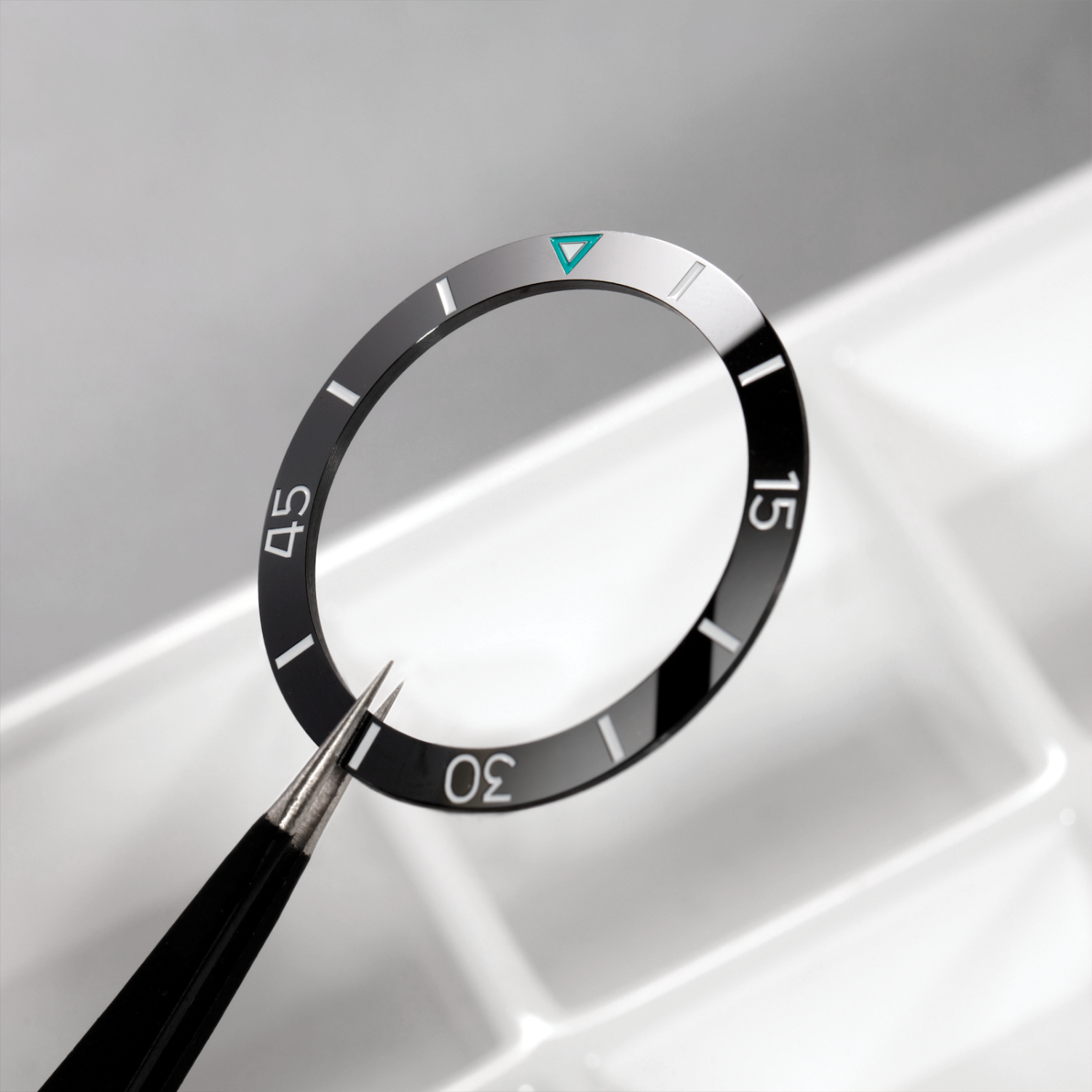 La ceramica in cui è realizzata la lunetta è levigata con una mola diamantata che le conferisce una finitura perfettamente lucida, sulla quale la luce si riflette in maniera netta e tagliente. Inoltre, l'indicatore delle ore 12 si distingue con un vivace colore acquamarina, sottolineando il forte legame di questo segnatempo con il mondo acquatico.