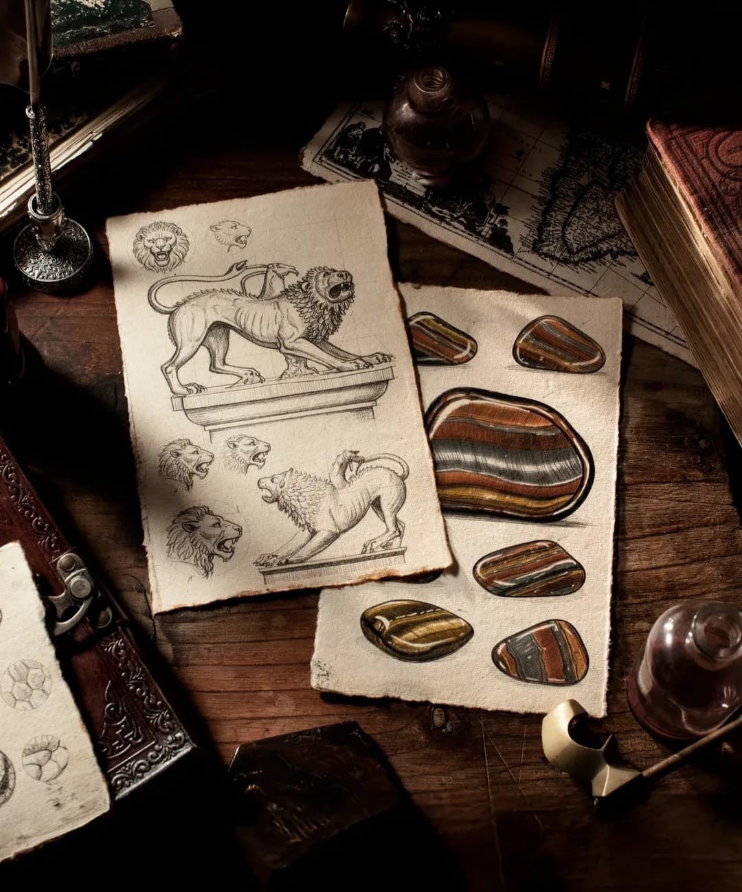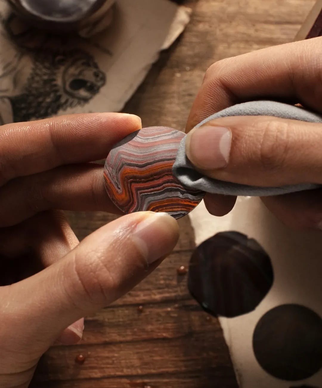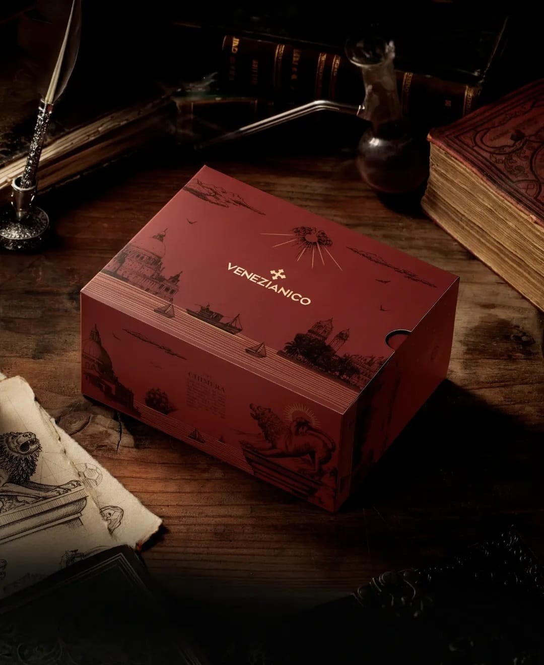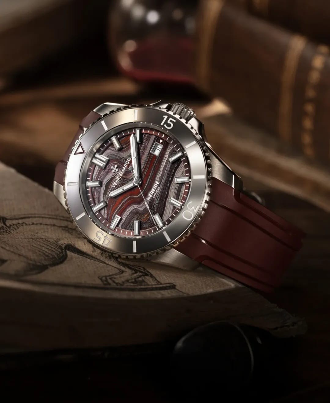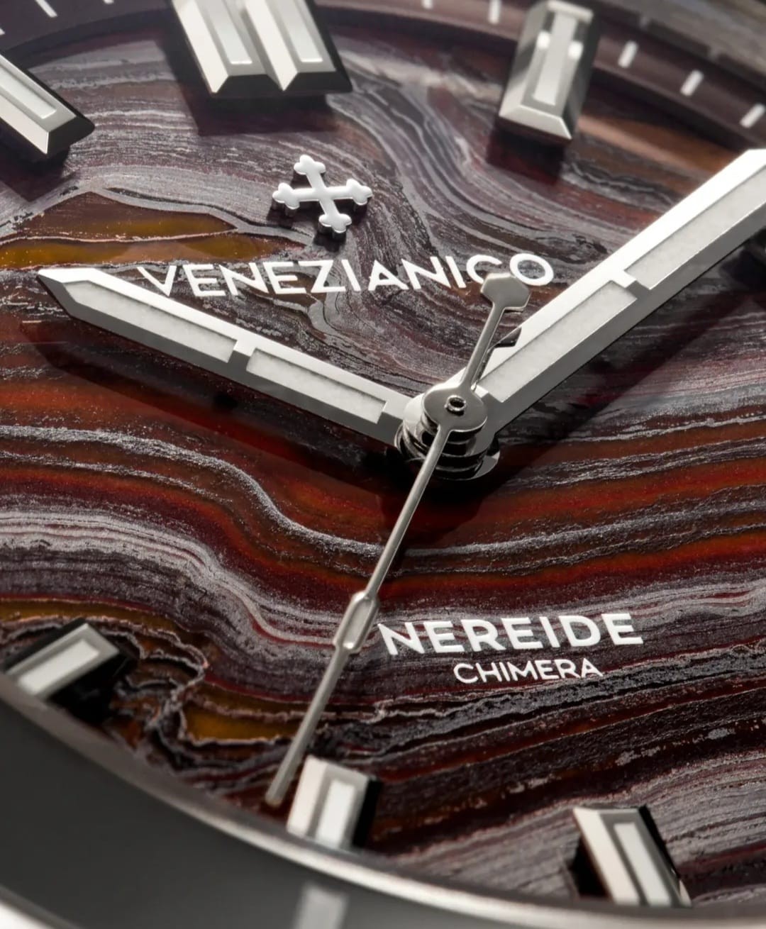 Nereide Chimera esplora l'idea di unione attraverso la materia. Il suo quadrante è realizzato in Iron Tiger, una pietra composita formata da Occhio di Tigre, Diaspro Rosso ed Ematite, dove minerali diversi si fondono in un'unica superficie definita da stratificazioni naturali e profondità visiva. Il nome Chimera rimanda a questa unione materica e a un più ampio riferimento culturale radicato a Venezia. Il leone alato, emblema della città, è esso stesso una chimera: una figura composta da diverse nature unificate in un'unica forma. Allo stesso modo, Iron Tiger riunisce minerali distinti in un'unica espressione materica.