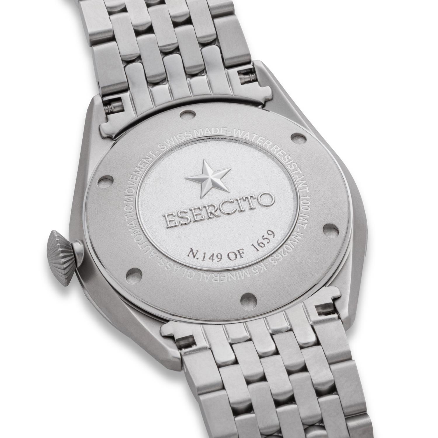 Dynawind solo tempo automatico, Cassa 42mm acciaio matt, quadrante verde militare con indici ed arabe in SPL C3, sfere in acciaio, movimento Sellita SW200, bracciale in acciaio matt. Edizione limitata Esercito Italiano di 1659pz.
