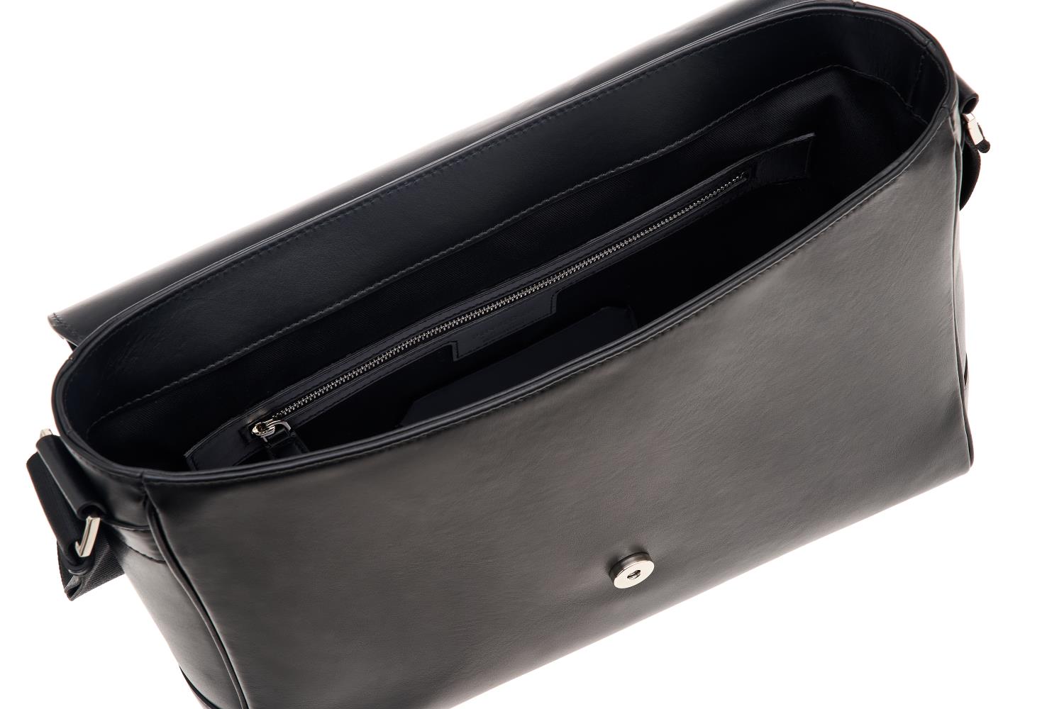 La chiusura con patta bombè con doppia calamita nascosta. L'interno è composto da una tasca interna ampia, un divisorio con tasca a zip, un porta cellulare, un porta biglietto da visita, un porta penne e una tasca con zip sul retro.