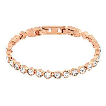 L'apprezzatissimo braccialetto Tennis Swarovski è ora declinato in un'attuale versione placcata oro rosa! Il filo di Clear Crystal montati a castone connoterà con il suo stile discreto e raffinato ogni abito. Il gioiello monta un fermaglio ripiegabile ed è abbinato ad un elemento-prolunga. - Lunghezza: 17 cm