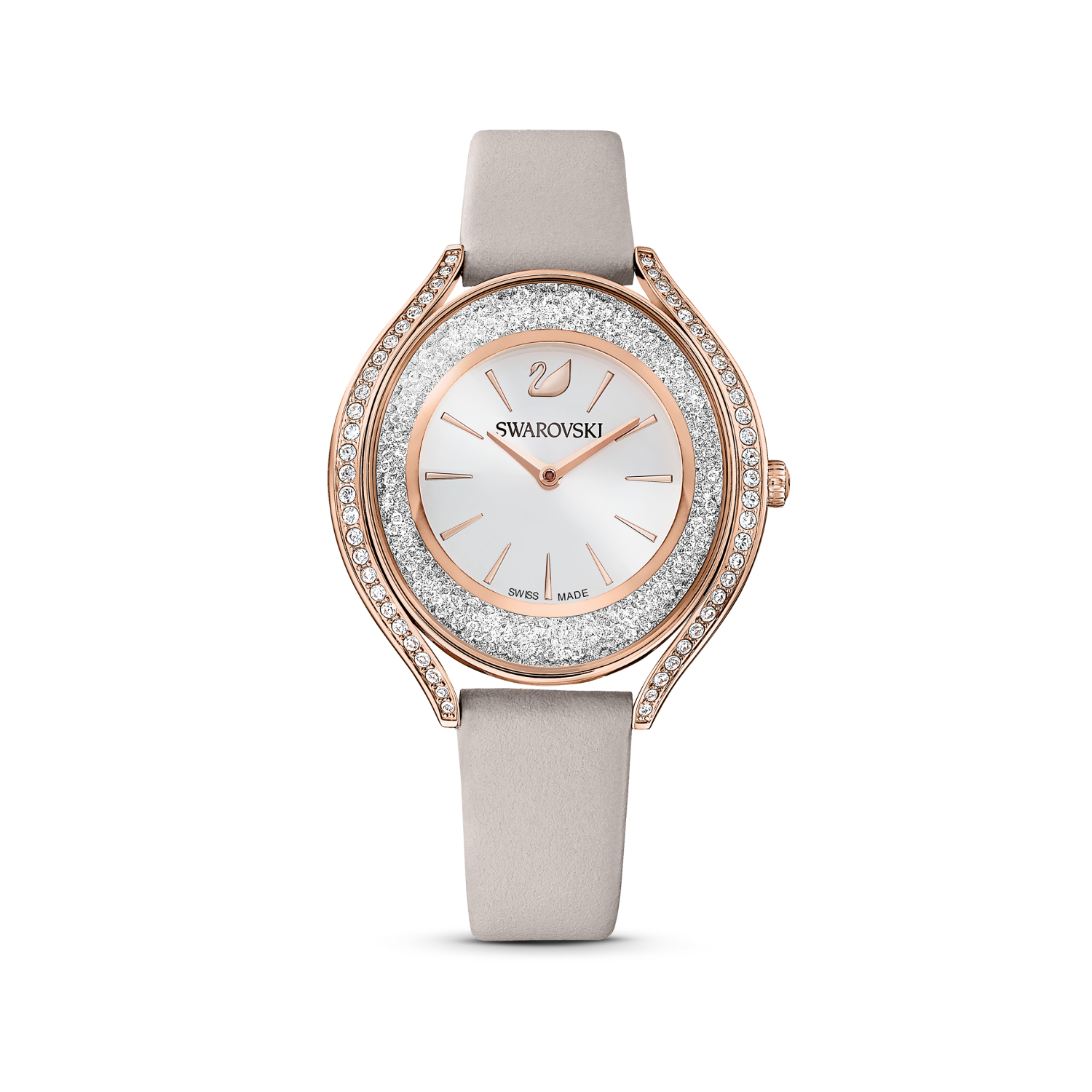 Swarovski - Orologio Crystalline Aura, Fabbricato in Svizzera, Cinturino in pelle, Grigio, Finitura in tono oro rosa Ref. 5519450